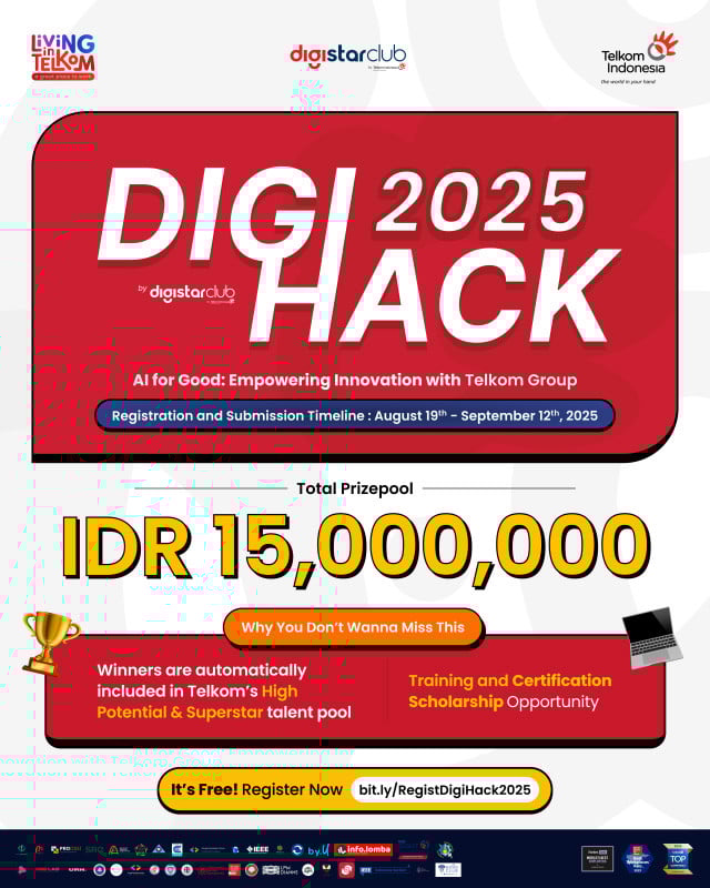 Pendaftaran DigiHack 2025 telah resmi dibuka mulai 19 Agustus hingga 12 September 2025. Seluruh Kandidat peserta dapat melakukan pendaftaran Melewati tautan bit.ly/RegistDigiHack2025.